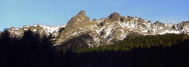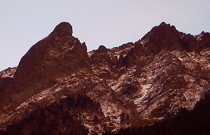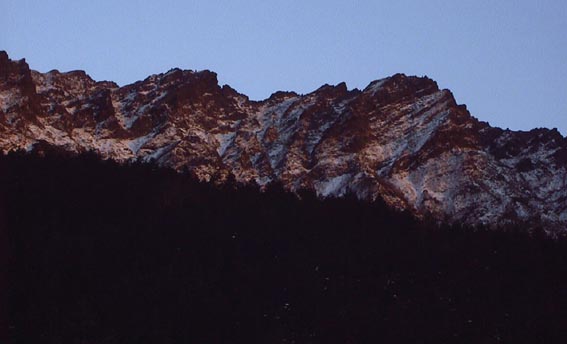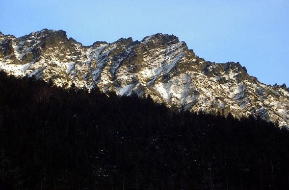 赤岳鉱泉(1泊2食7500円)には15時着。横岳、赤岳西壁が夕日に染まるのに何とか間に合う。夕食までの時間にこの小屋のテラスに三脚を据えて夕日に染まる横岳西壁を撮る。日が傾くに従い山の色も微妙に変化する。望遠で大同心を狙うとアブミがキラリと光った。こんな時間でどこにビバークするのであろうか。少し驚く。