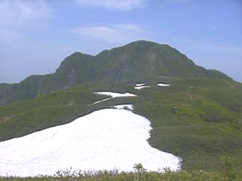 ![]() 登り着いた笹平から雨飾山山頂を望む |