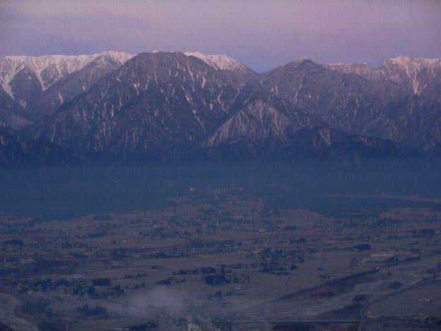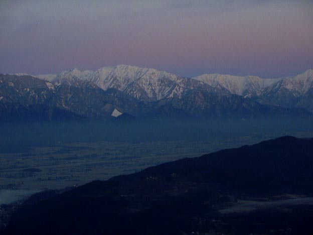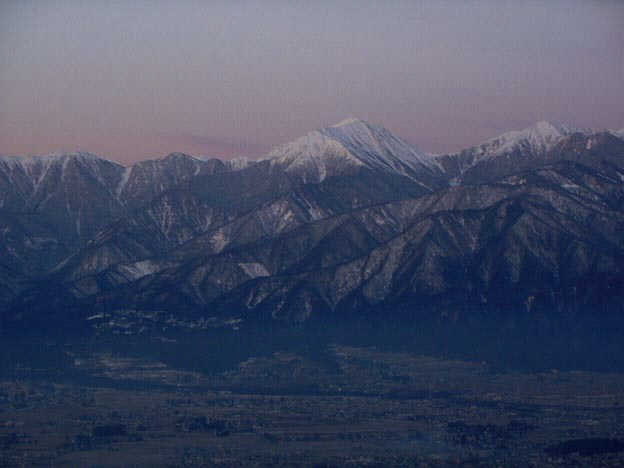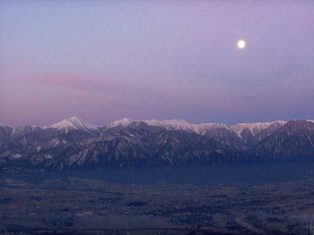 日の出前、安曇野はまだ深い闇の中・・・ 安曇野のシンボル、常念岳の夜明けが始まろうとしている・・・ 気温マイナス13℃・・・ 安曇野のもう一つの主役、有明山も朝の光を待つ・・・ 安曇野の北には大きい蓮華岳が横たわっている・・・ 山々が朝の光にほんのりとピンク色に染まる頃、 満月が太陽と入れ替わるように沈んでゆく・・・ [次へ]