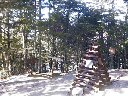 夜叉神峠を出ると、すぐ樹林帯に入り展望がきかなくなる。1時間ほど歩くと突然両足の太腿が痙攣する。しまった!10日前に体調を崩して点滴を打っていたが体力がまだ回復していないのか。すぐ休憩して暖かいココアを飲み、体を温めて歩き出すがすぐまた痙攣である。困った。ここでは雪は無かったが足への負担を少しでも軽くしようとピッケルを取り出す。少しは効果あり。あとは体を冷やさないようにマウンテンジャケットを着込む。大崖頭山近くの杖立峠に着いたのはコースタイムを1時間オーバーした11時過ぎであった。 杖立峠の標識を過ぎると一端少し下りまた緩やかな樹林帯の登りが続く。途中、年の頃は70を超えていそうな人に出会う。何と荷物が二つあり、片方づつ背負って30分位の区間を何回も往復していながら登っている。あくまでマイペースで登るその姿に元気づけられたのであった。 |